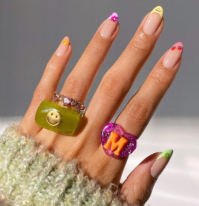 Daca esti genul care poarta tricouri traznite si cele mai „ciudate” combinatii de imprimeuri si culori, imbratisand orice trend care implica blana, paiete si alte texturi, aceasta manichiura ti se potriveste perfect. Practic, ea se bazeaza pe o manichiura french colorata in nuante pastelate, cu aplicatii si desene simpatice. Este un French jucaus si cool, cu atitudine si personalitate!