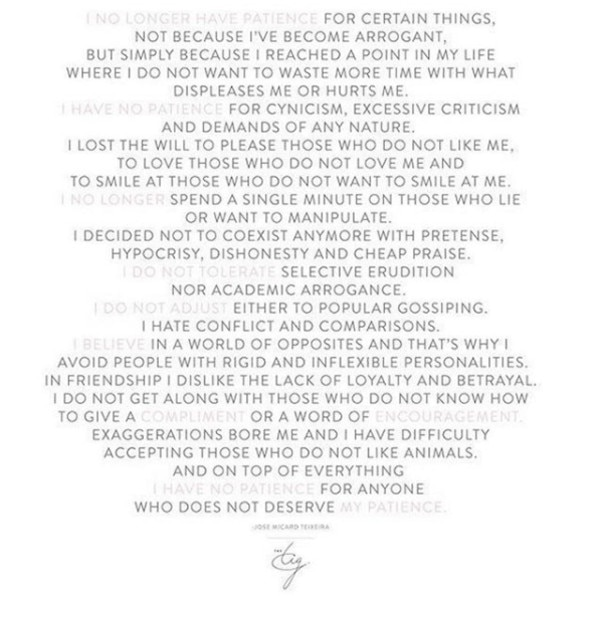Primul rand al citatului suna astfel: „Nu mai am rabdare pentru anumite lucruri, nu pentru ca am devenit aroganta, ci pur si simplu pentru ca am ajuns la un punct in viata mea in care nu vreau sa mai pierd timpul cu ceea ce ma nemultumeste sau ma raneste”.