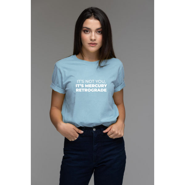 Tricou albastru din bumbac organic It’s not you, it’s Mercury retrograde, 129 lei, shop.andreearaicu.ro