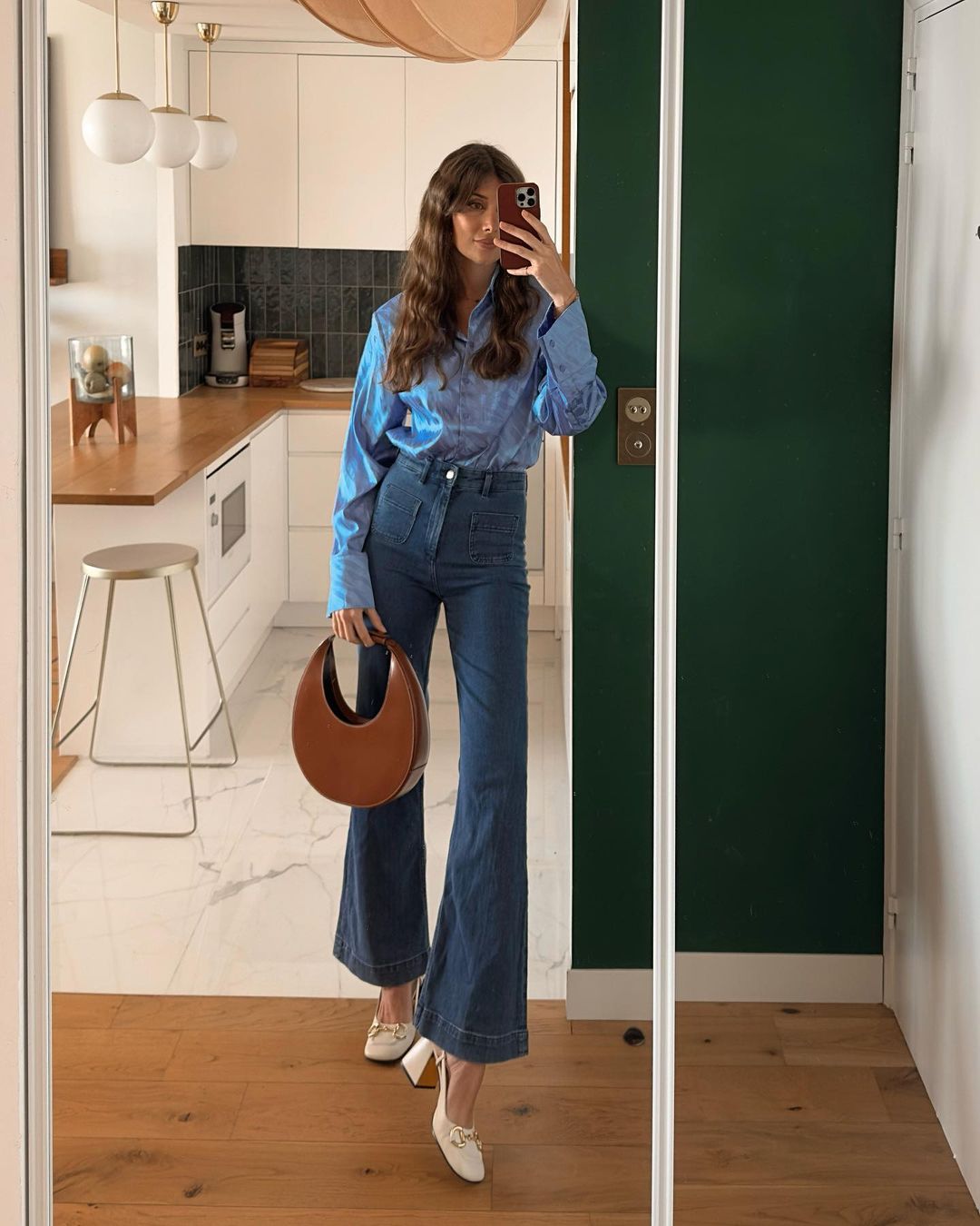 O pereche de jeans arata mai stylish purtata cu o bluza feminina cu detalii speciale. Materialul satinat ii confera un aer feminin si rafinat, mai ales daca alegi sa porti niste botine sau balerini in loc de adidasi. Iti recomand sa bagi camasa in jeansi, astfel vei accentua talia si iti vei alungi picioarele daca alegi un model cu talie inalta.