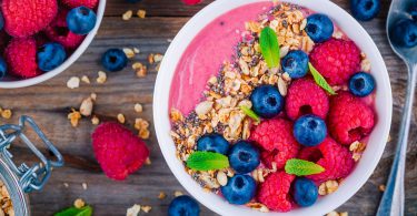 Smoothie cu granola, afine si zmeura
