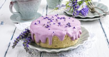 Prajitura cu branza ricotta, afine si glazura de lavanda
