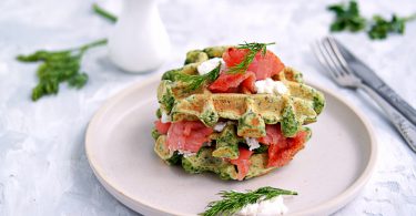 Mic dejun rapid: gofre cu burrata, rosii si prosciutto