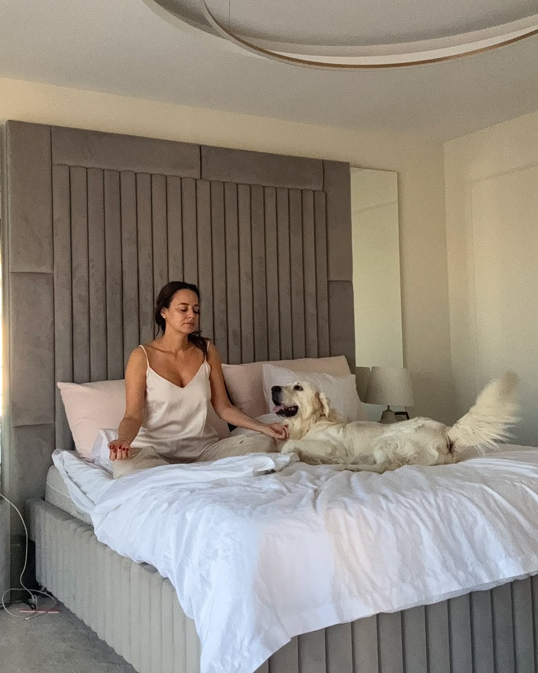 Ma trezesc la 7:30, dau la o parte draperiile pentru a lasa camera sa fie inundata de lumina. Dormitorul meu are o lumina frumoasa, asa ca imi place sa-mi fac aici rutina de yoga Pranayama (yoga si exercitii de respiratie).