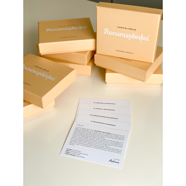 Recunostinta este unul dintre cele mai importante obiceiuri pentru sanatatea noastra mentala si emotionala. Sa practici recunostinta inseamna ca apreciezi tot ceea ce este bun in viata si toate acele lucruri pe care ar trebui sa le pretuiesti. Cartolinele Recunostintei includ 30 de exercitii. Poti alege in fiecare zi o cartolina care sa te inspire. Task-urile care iti plac cel mai mult pot deveni obiceiuri zilnice, altele saptamanale, pe care sa le integrezi treptat in viata ta.