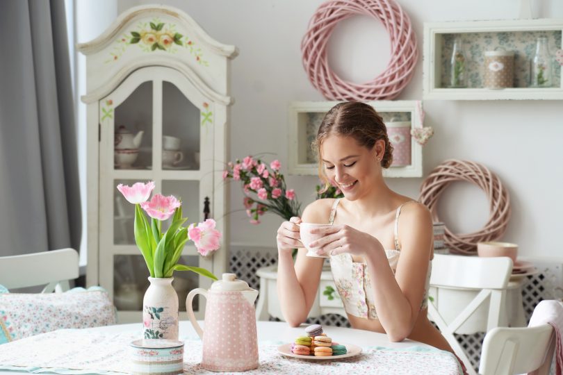 • adopta stilul shabby chic in care predomina imprimeurile florale, volanasele si nuantele dulci si calde precum verde, roz, albastru, crem, alb si gri;