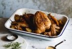 Friptura de pui la cuptor cu cartofi dulci si curmale (si o salata bonus)