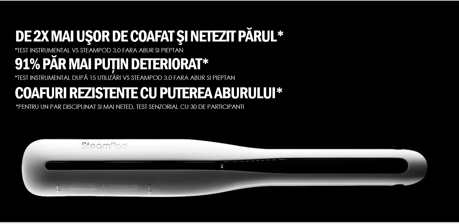 Dar beneficiile nu se opresc aici: Steampod 3.0 imi indreapta parul mai repede, insa riscul de deteriorare este cu 91% mai mic, datorita tehnologiei avansate cu aburi. Da, chiar e posibil sa-ti coafezi parul de cateva ori pe saptamana fara sa te temi de fire despicate si acel aspect de „matura”.