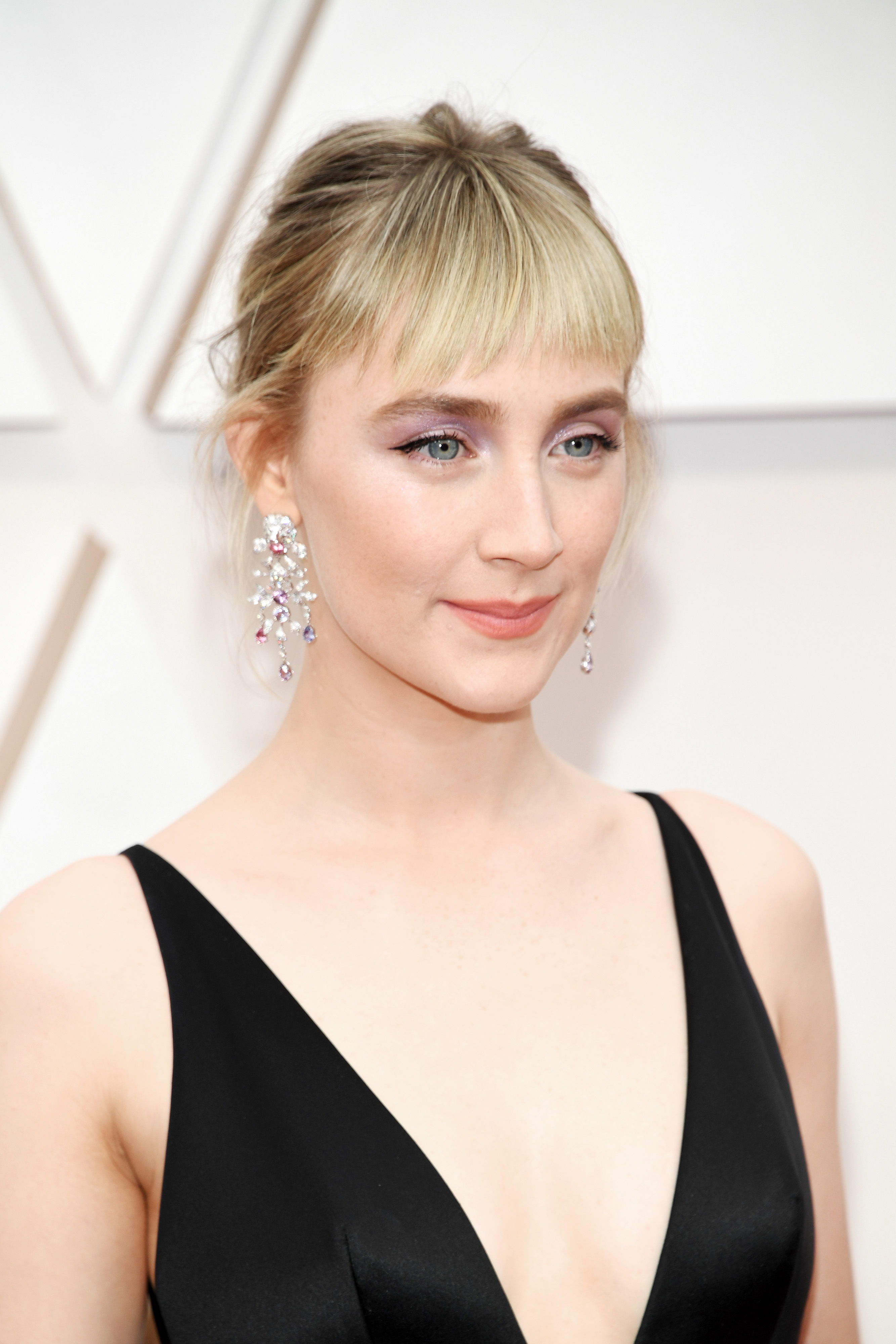Machiajul lui Saoirse a fost inspirat de rochia spectaculoasa a acesteia, o combinatie de negru si lavanda delicata. Aceeasi nuanta de lavanda a fost folosita si pe pleoape, insa intr-o textura aproape transparenta, abia perceptibila. Acest lucru a permis „ridicarea” ochilor printr-un eyeliner negru, concentrat in coltul extern.