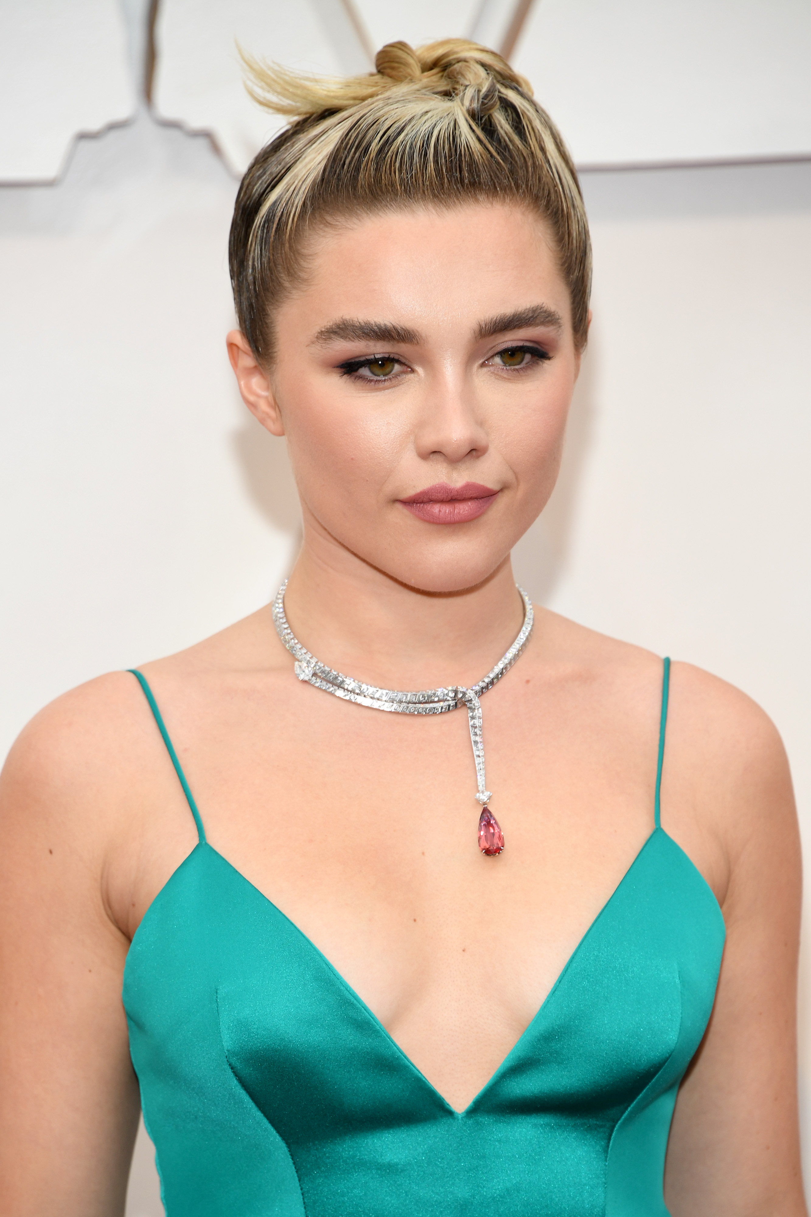 Si Florence poarta o coafura neasteptata: o impletitura rasucita, prinsa intr-un coc. Machiajul ei e „cuminte”, compus din culori neutre si texturi mate.