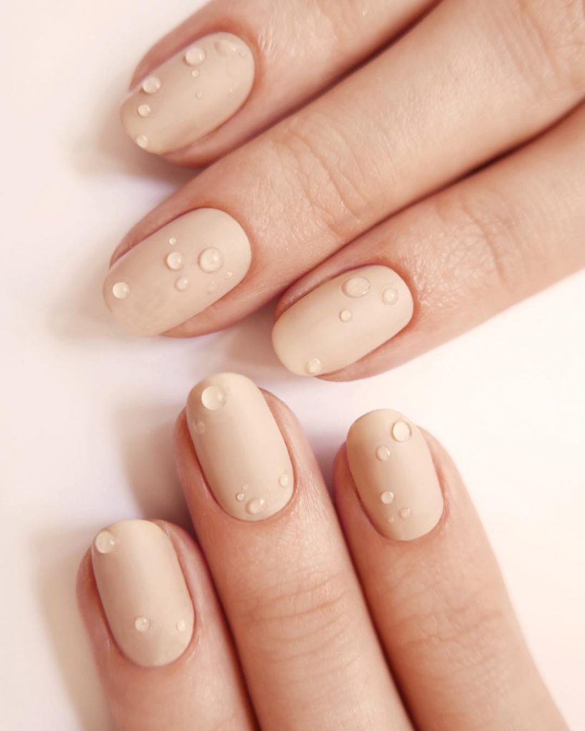 Ai nevoie de o oja bej foarte mata si de un lac de unghii transparent cu textura groasa pentru a aplica „picaturile de apa” din loc in loc. Exista si aplicatii care se lipesc pe unghie in magazinele de specialitate. Iata un mod de a crea impact ramanand totusi in sfera clasicului.