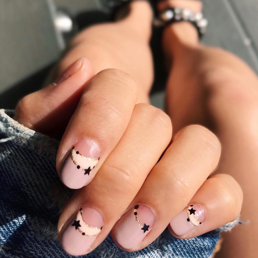 Incepe sa aplici o culoare pastelata imediat sub cuticule, urmand forma lor rotunjita (cuticulele raman naturale), apoi traseaza curbe cu sclipici auriu si lipeste apoi cateva stelute mici, preferabil albe sau negre, pentru un look mai stilat.
