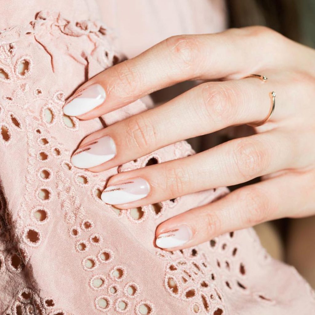 Albul pe unghii arata foarte sofisticat, dar daca te-ai plictisit de el, adauga-i o tusa magica: peste un lac semi-transparent laptos pune un alb mat pe jumatate de unghie, apoi picteaza doua linii cu sclipici auriu sau argintiu. Le poti pune unde vrei tu, nu e musai sa recreezi look-ul din fotografie. Fii creativa si distreaza-te!