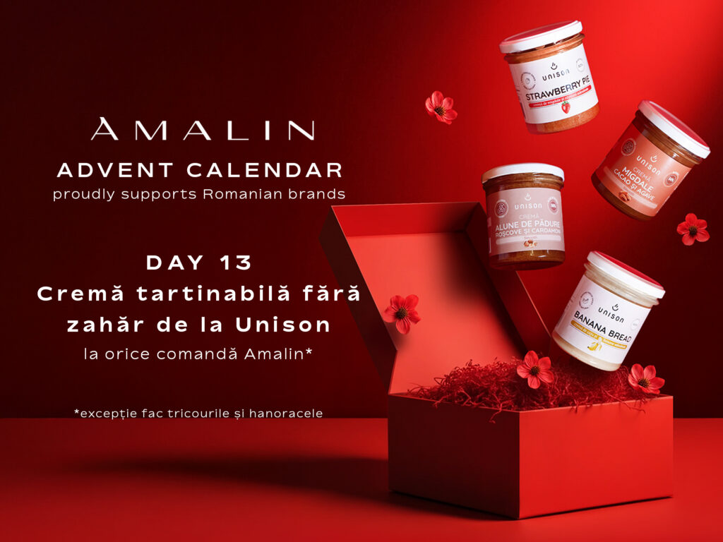 Dar trebuie sa-ti dezvaluim un secret. Exista gustari delicioase si sanatoase, fara zahar si chimicale adaugate, care iti pot satisface oricand pofta de ceva bun. De aceea, cadoul pentru ziua 13 din cadrul calendarului Advent Amalin este un borcan cu delicii tartinabile de la Unison.