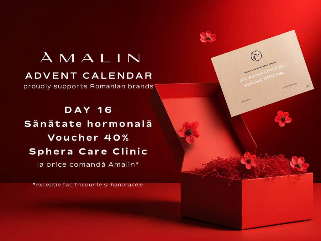 Stim cat este de important acest aspect al sanatatii femeilor, de aceea in ziua 16 a Calendarului Advent Amalin iti oferim un voucher cu 40% reducere pentru consultatie Echilibrul Hormonal la Sphera Care Clinic. Primesti voucherul la orice comanda* Amalin din magazin sau de pe site-ul shop.andreearaicu.ro (*exceptie fac tricourile si hanoracele).