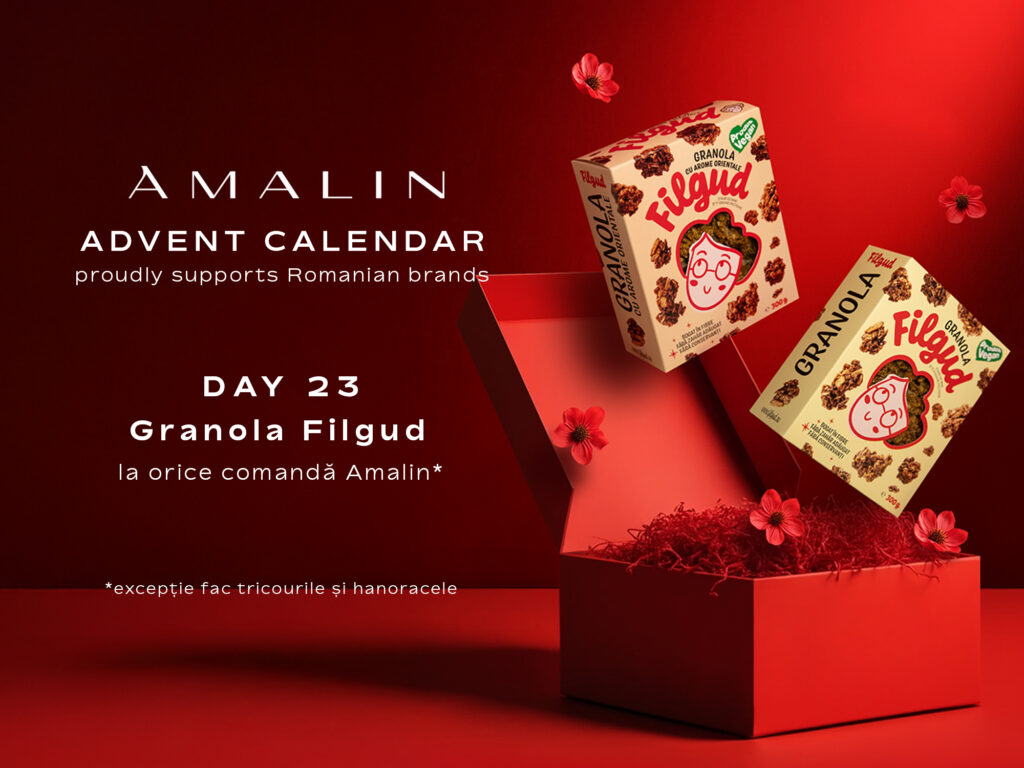 Cadoul Advent Amalin de azi, 23 decembrie, este o cutie de Granola Filgud, un produs vegan, bogat in proteine, fara zahar adaugat. Vei primi cadoul la orice comanda Amalin din magazin (Str. Paris nr. 7A) sau de pe shop.andreearaicu.ro (*exceptie fac tricourile, hanoracele si produsele de dezvoltare personala).