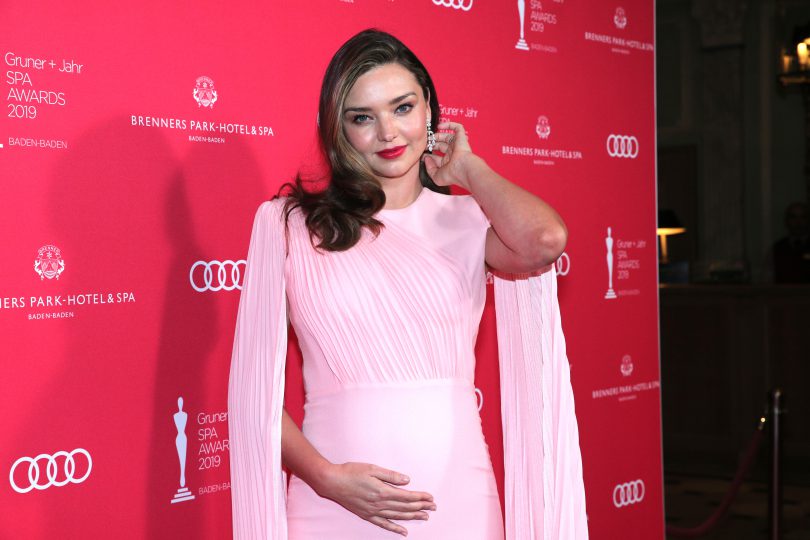 Supermodelul australian de 35 de ani a anuntat vestea pe Instagram, postand o fotografie cu ea imbratisandu-si burtica pe covorul rosu Gruner + Jahr Spa Awards in Baden-Baden, Germania. Miranda era prezenta la ceremonie pentru primi premiul Beauty Idol, pentru rolul ei ca fondator al brandului de cosmetice organice Kora Organics.
