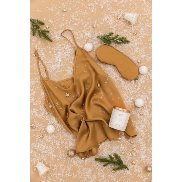 Pachetul cu masca de dormit, top cu bretele subtiri satinat si lumanare parfumata este intruchiparea clasica a rasfatului pentru o femeie.