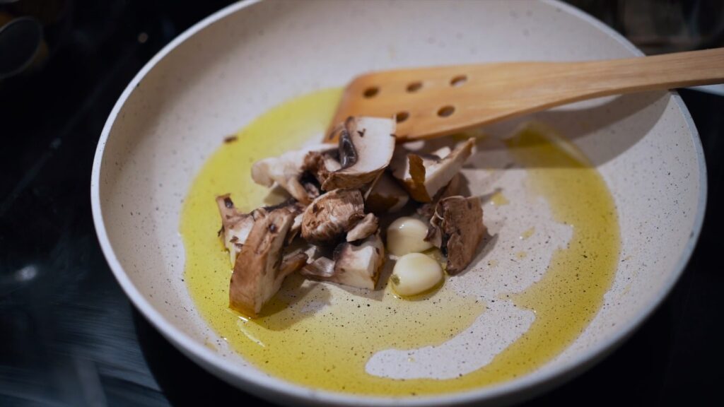 Pasul doi consta in pregatirea ciupercilor, care se spala bine si se taie felii. Intr-o tigaie mare am turnat putin ulei de masline si am pus un catel de usturoi intreg. Dupa ce usturoiul a inceput sa se rumeneasca am adaugat ciupercile, pe care le-am calit la foc mare timp de 2 minute, apoi am redus focul si le-am gatit timp de aproximativ 8 minute. Am adaugat sare si cateva frunze de patrunjel tocat.