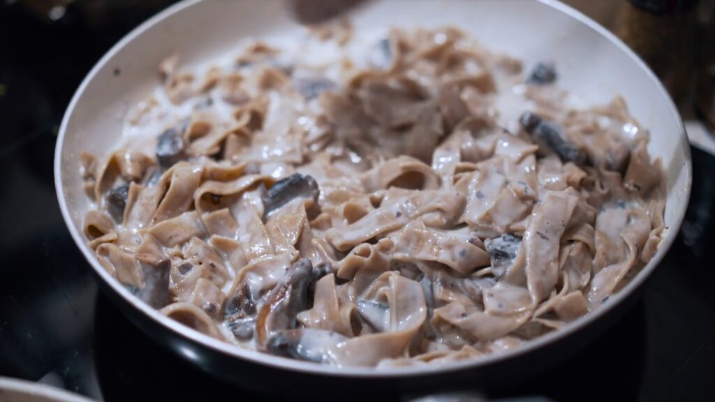 Cand pastele sunt fierte, se scurg si se adauga in tigaia cu ciuperci. Am adaugat apoi sosul bechamel, parmezanul ras si putin piper proaspat macinat. Am mai lasat pastele pe foc timp de 2 minute, timp in care am amestecat cu grija pentru a distribui sosul uniform.