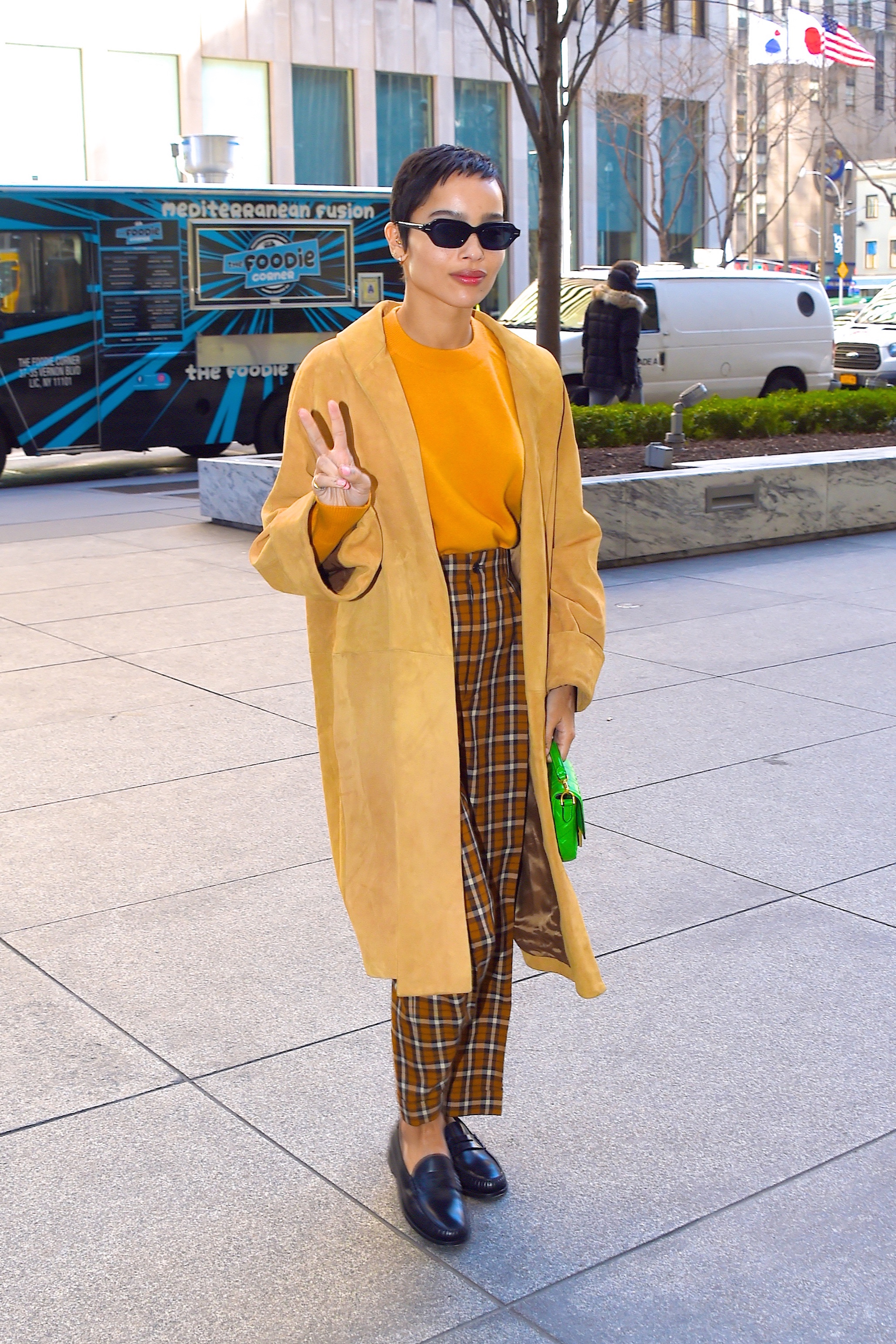 Zoe Kravitz pare sa stie deja ca tonurile de galben sunt vedetele acestui sezon. Actrita a purtat o tinuta formata din pulover galben, pantaloni in carouri in tonuri de maro si galben mustar, completate de o haina lunga bej si pantofi loafer negri.