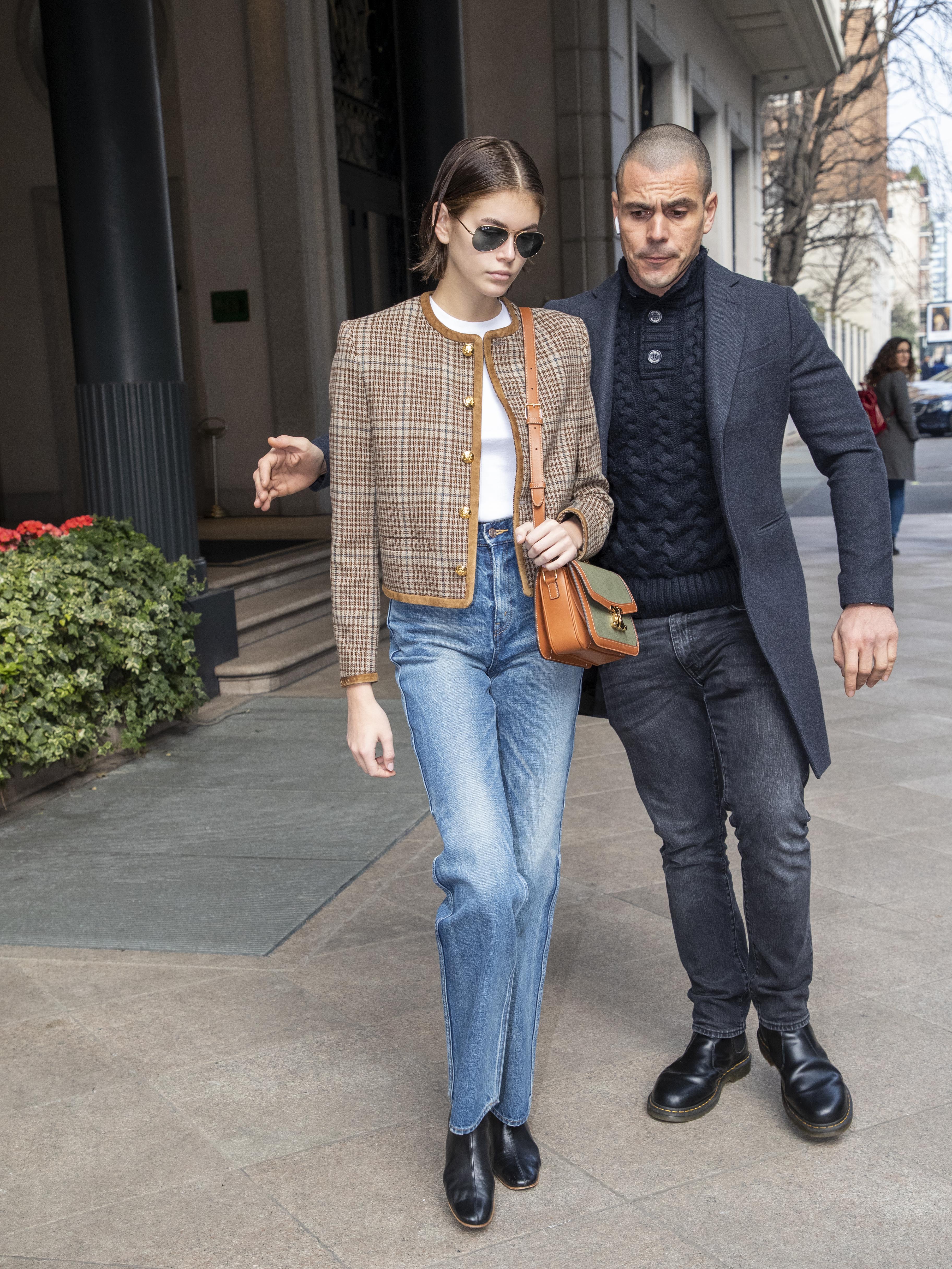 Kaia Gerber incepe sa devina treptat una dintre tinerele staruri apreciate pentru stilul vestimentar impecabil. Aflata la Milano pentru Saptamana Modei, Kaia a purtat un sacou in carouri cu aspect vintage cu o pereche de jeansi drepti si botine cu toc lat.