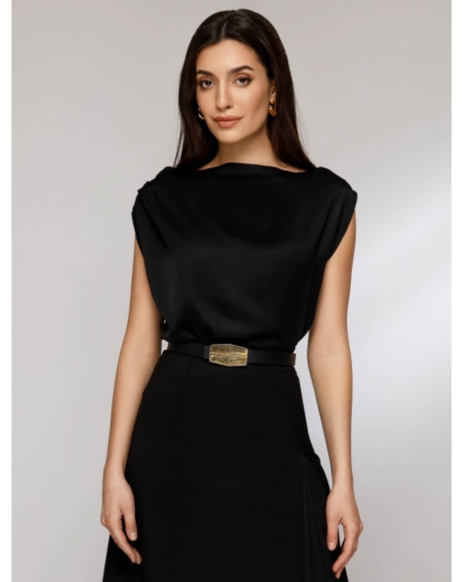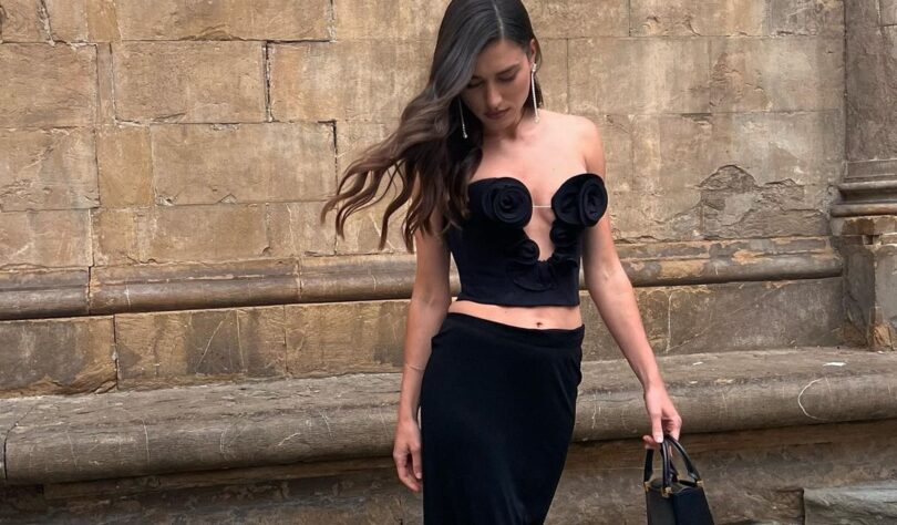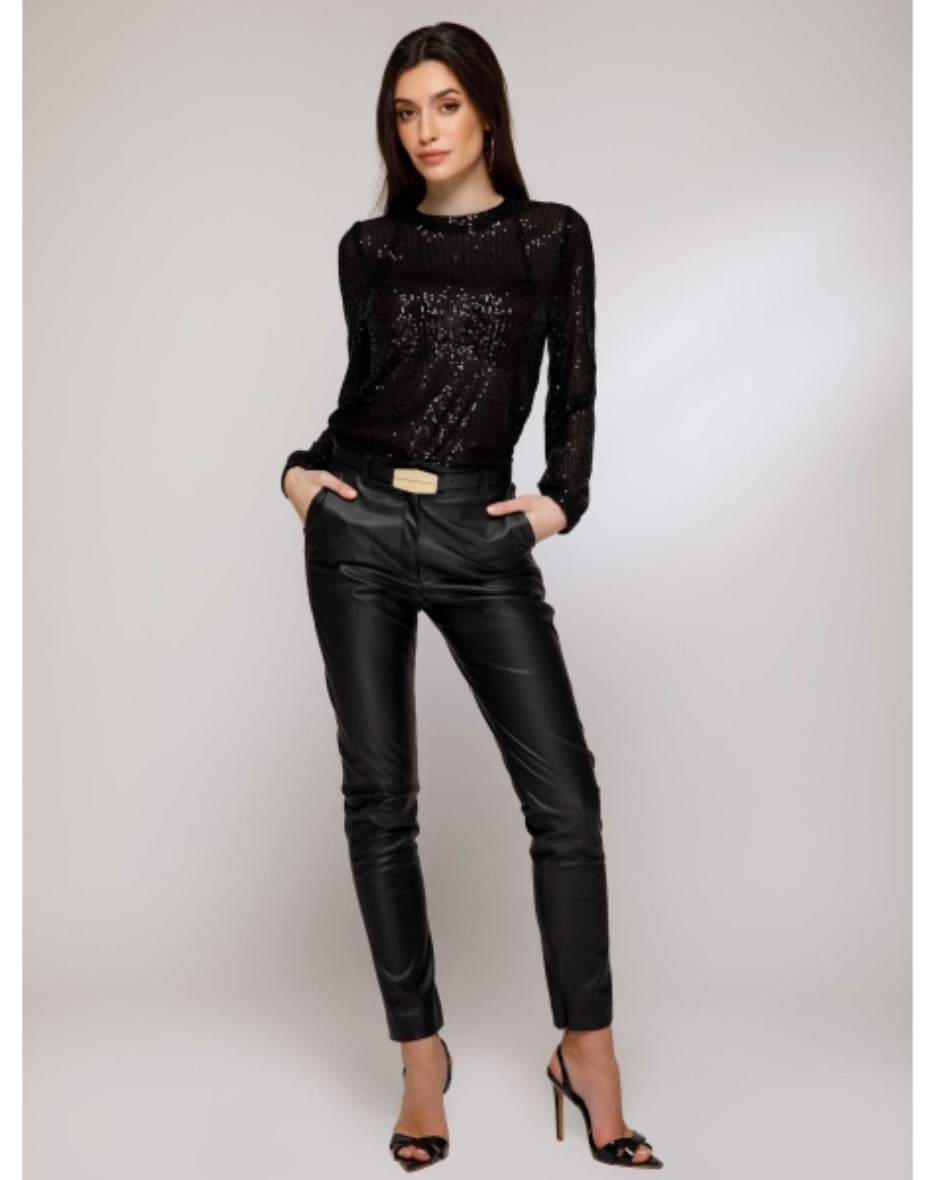 Pantalonii de piele mi se par o piesa deosebit de versatila, ideala inclusiv pentru un look de club. Ii vad purtati cu botine inalte si un top fin, usor drapat, iar la gat as suprapune mai multe coliere aurii. As merge pe un look all black, astfel incat sa pastrez o aura de mister, iar singura pata de culoare ar fi un ruj rosu intens, ideal pentru un look de seara. Este o tinuta actuala, sexy, stilata si care iti ofera acel look effortlessly chic.