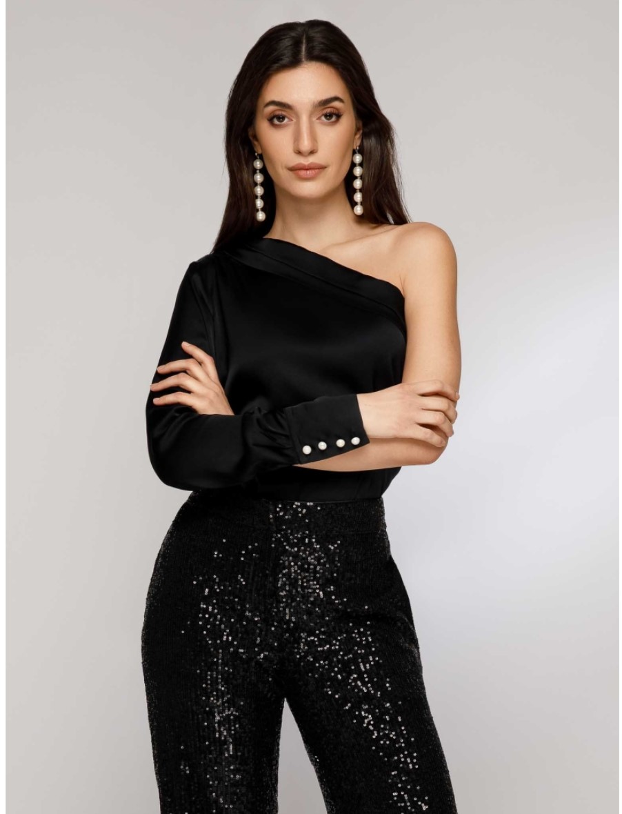 Camasa cu un umar gol este perfecta pentru o tinuta glam, usor eleganta si totusi actuala. Este o piesa care atrage toata atentia, astfel ca o vad purtata alaturi de piese mai relaxate, precum o pereche de jeansi drepti sau boyfriend. Mi se pare o juxtapunere de texturi interesanta, tinand cont de materialul fin al camasii, in contrast cu denimul dur.