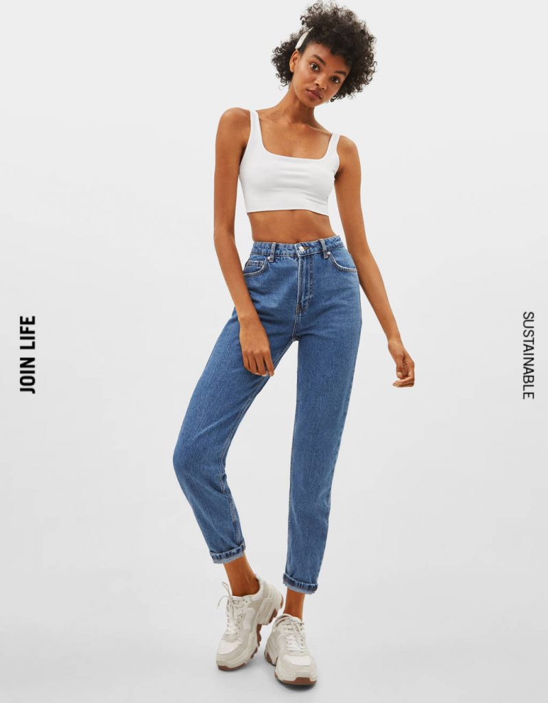Jeansii din denim deschis la culoare merg de minune cu o bluza alba, dintr-un material confortabil si mulat pe formele corpului.