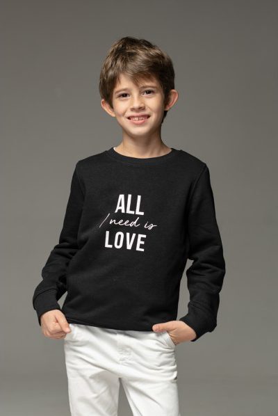 Negrul este o culoare atemporala, care va fi mereu in trend si va arata bine in orice combinatie. Acest hanorac modern, deosebit de calduros, are un mesaj optimist care sa va faca pe amandoi sa zambiti: „All I need is love”. Pentru ca mai presus de orice altceva, copiii nostri au nevoie de dragoste. Atunci cand el poarta acest mesaj, iti vei aminti ca e important sa-i si arati acea dragoste imensa pe care o simti pentru el, chiar si dupa o zi lunga.