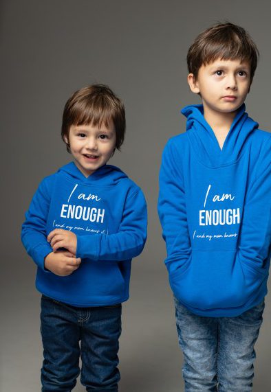 Acelasi model de hanorac cu gluga arata incredibil si pe albastru, perfect pentru baietei, dar si pentru fetite. Mesajul puternic „I am enough (and my mom knows it)” e menit sa-i dea incredere ca e indeajuns de bun si de cuminte pentru tine, chiar si atunci cand face vreo boacana. Iar atunci cand copilul tau il poarta, iti vei aduce aminte ca acest mesaj e valabil si pentru tine: esti o mama buna, esti o femeie indeajuns de blanda, de rabdatoare.
