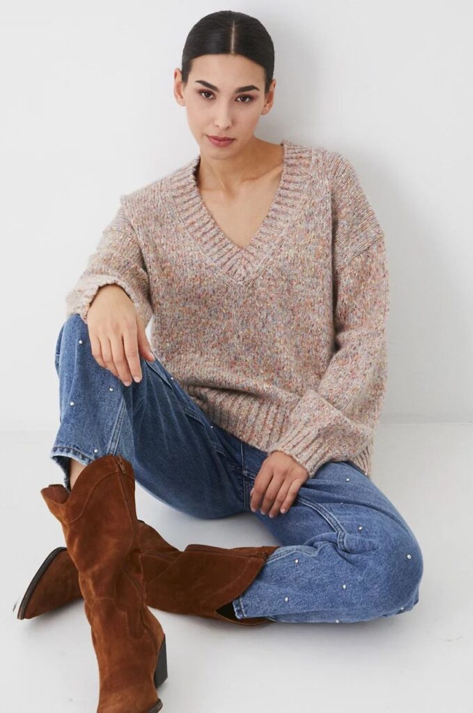Sa alegi intre un pulover cu decolteu de tip V sau unul cu guler la baza gatului este o decizie ce tine de preferinte si stilul personal. Dar indiferent pe care il preferi mai mult, este important sa ai din ambele timpuri pe care sa le poti include in tinutele tale prin rotatie. Puloverul cu decolteu V sau cu anchior asa cum este numit adesea, arata excelent purtat deasupra unei camasi sau a unei bluze cu guler. Adauga un plus de farmec unei tinute si in acelasi timp iti permite sa accesorizezi cu unele coliere pe care vrei sa le pui in evidenta.