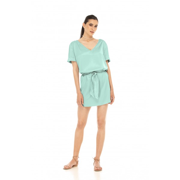 N-ar strica sa ai in garderoba si o rochie intr-o nuanta serena de vara, cum este acest turcoaz satinat. Croiala simpla si cordonul ce accentueaza talia o fac o piesa de baza, ce nu se va demoda curand. Poate fi purtata atat in casa, cat si in oras, cu sandale comode sau chiar cu toc.