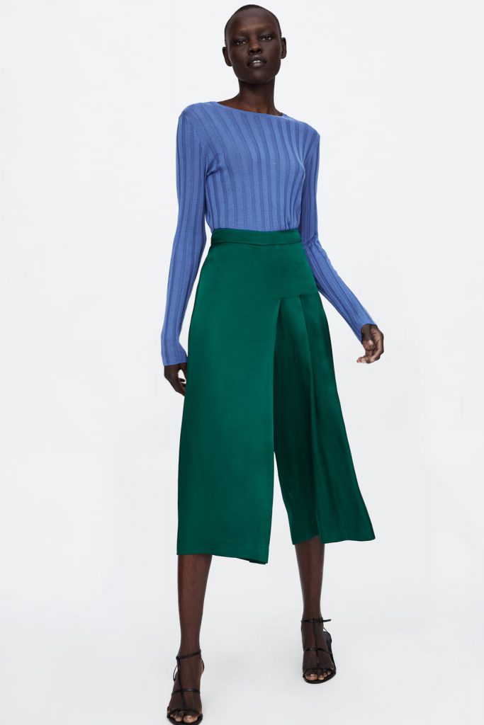 Nu ma dau in vant dupa combinatii tari de culori, dar asta imi place la nebunie. La fel cum imi place rozul impreuna cu rosul. Opteaza pentru o pereche de pantaloni din satin, in cazul acesta unii tip culottes, pe care sa ii porti cu un pulover dintr-un material subtire. Efectul va fi unul ultra elegant.