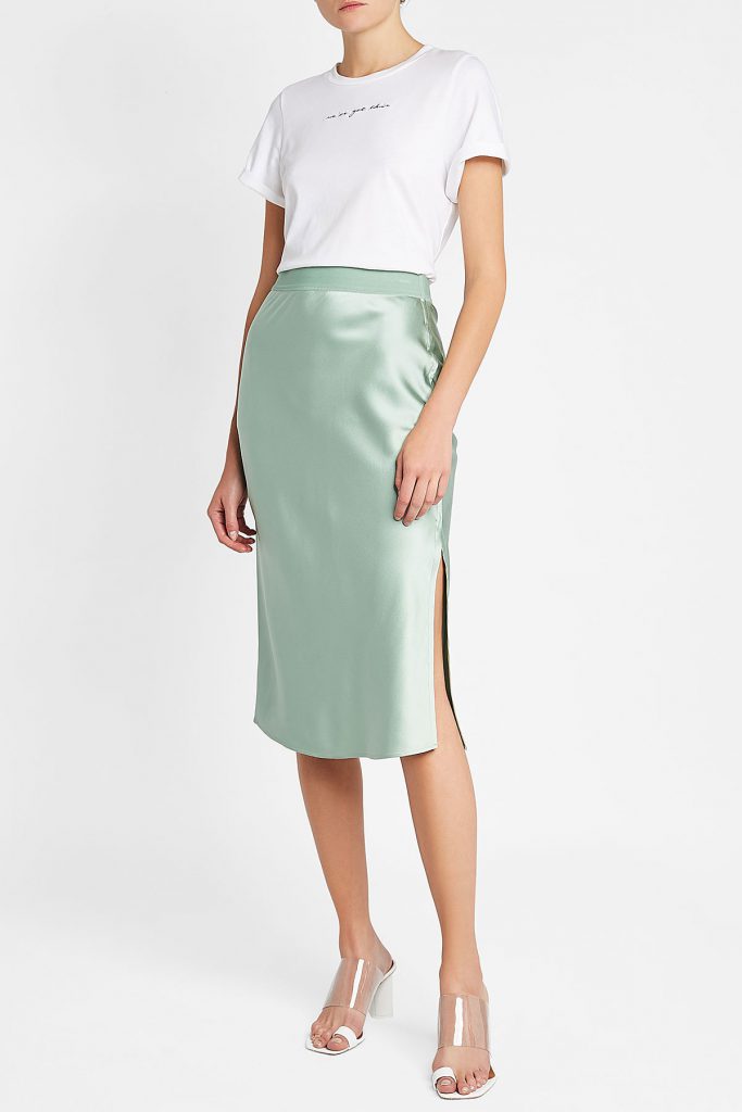 Fusta din satin este urmatoarea pe lista mea de cumparaturi. Chiar daca primul meu impuls ar fi sa cumpar una neagra, trebuie sa recunsosc ca m-am indragostit de aceasta nuanta verde menta.