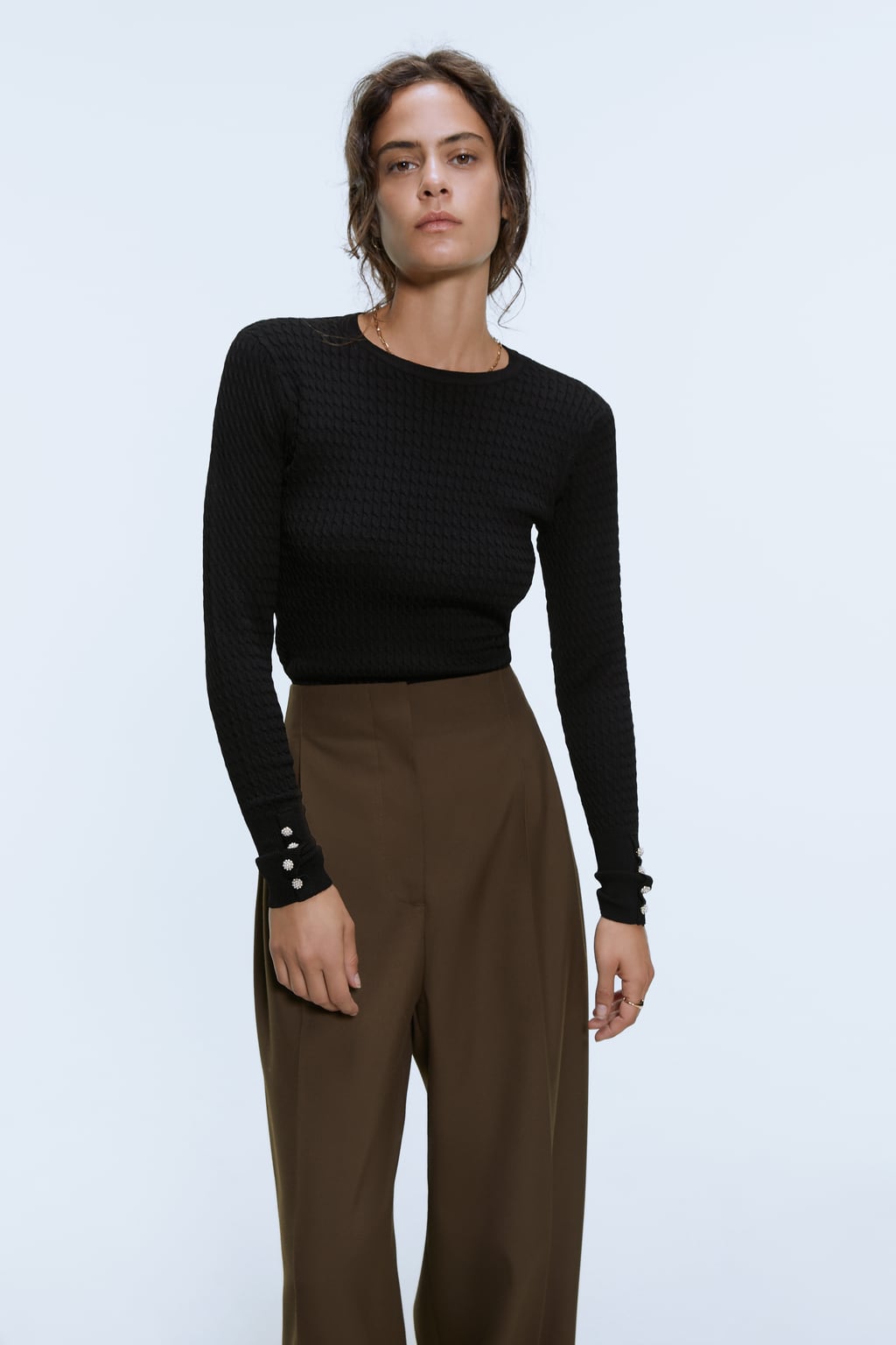 Un pulover negru, minimalist va fi pretios in colectia ta. Este ideal pentru tinutele office, pentru ca iti da un aer stilat si usor oficial. Totusi, poate fi combinat si in tinute relaxate. Oricum, vibe-ul este unul chic si feminin.