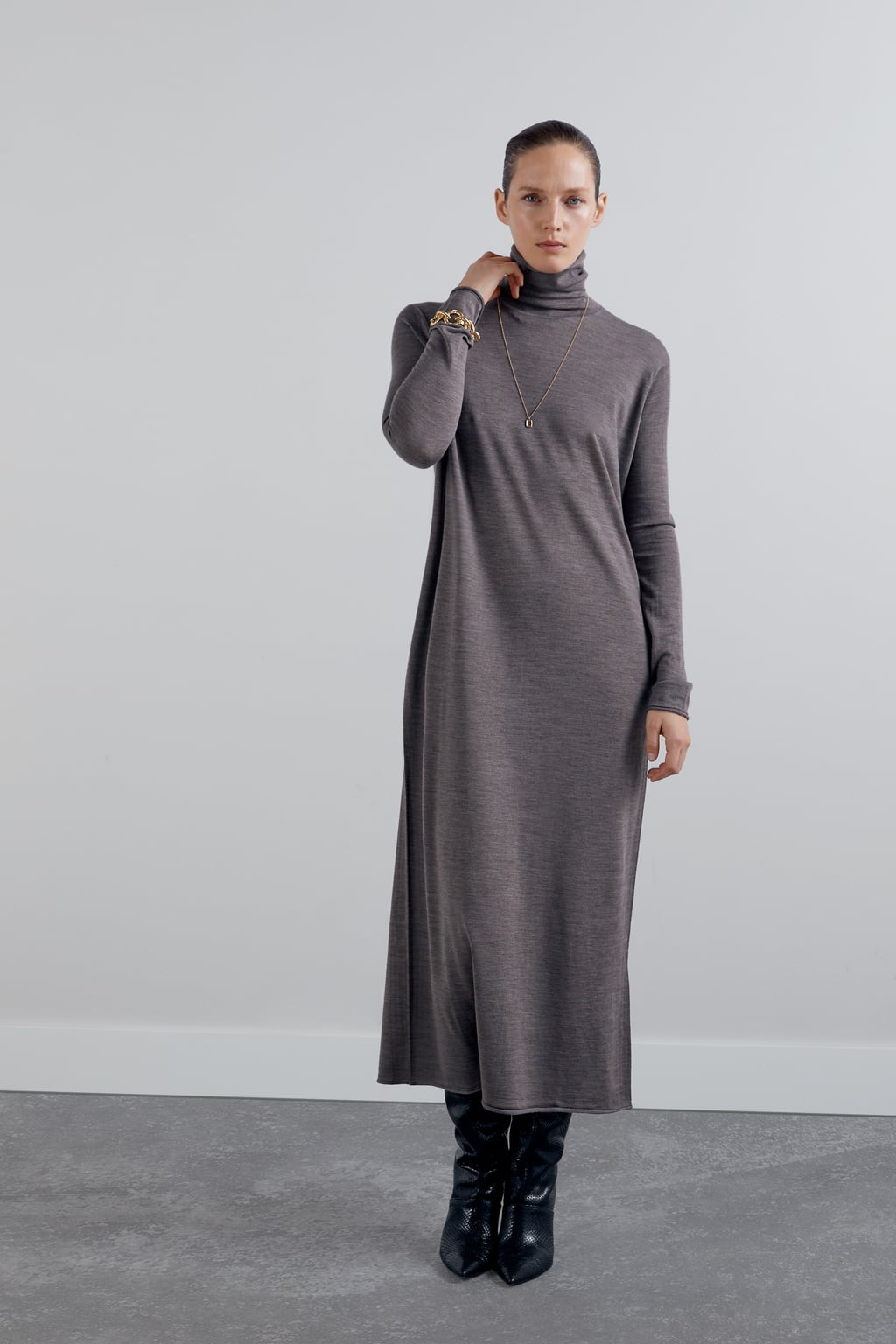 Rochia cu maneci lungi si guler e foarte chic pe timp de iarna, si este potrivita pentru un stil office. Mai mult decat atat, este destul de calduroasa, mai ales daca e confectionata dintr-un amestec de lana. O culoare neutra, asa cum este gri sau bej, va arata „scump” si te va ajuta sa compui tinute stilate in numai cateva cuvinte. Poart-o cu botine negre sau cizme lungi si cu o genta oversize.