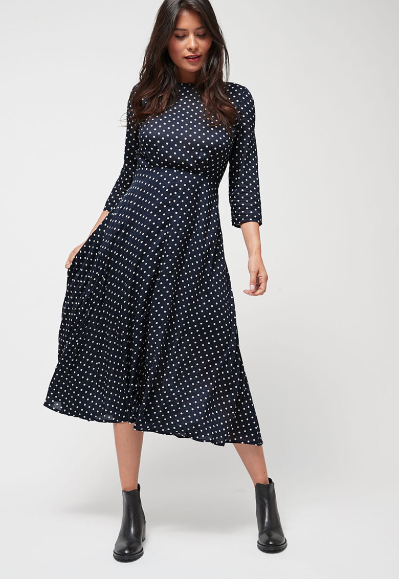 Daca iti doresti un stil ceva mai elegant, ia in considerare rochia cu maneca lunga si buline, care iti accentueaza talia. Faptul ca e larga in partea de jos iti ofera libertate de miscare si o senzualitate aparte. Poarte fi purtata atat cu botine scurte, cat si cu cizme lungi.