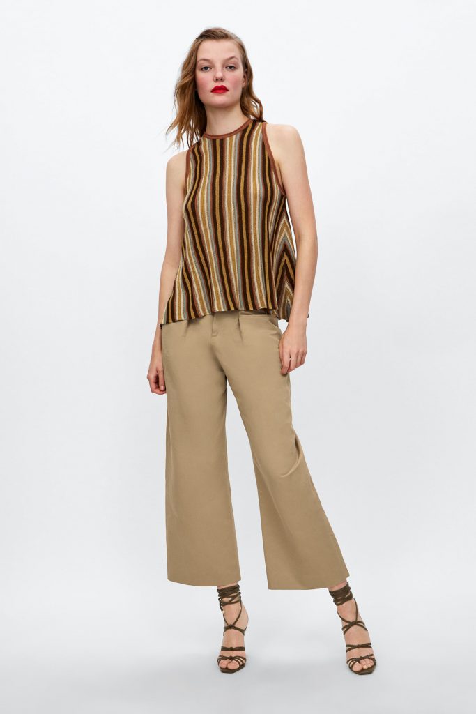 Un top fara maneci, in dungi groase si asimetrice, merge perfect cu o pereche de pantaloni capri, potrivit de mulati pe corp. Obtii un look chic si elegant, dar simplu in acelasi timp.