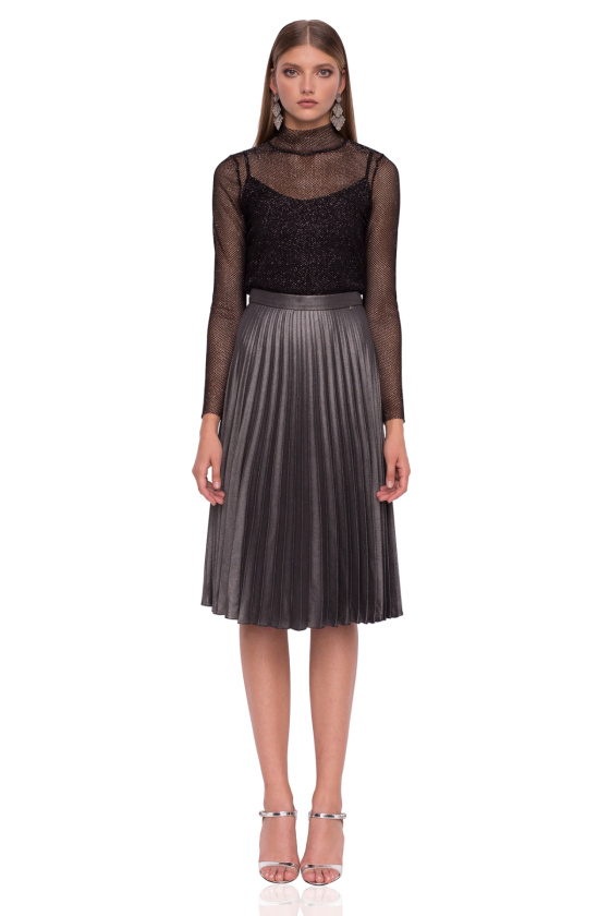 Prin urmare, tinuta pe care ti-o propunem este formata din doua piese vestimentare clasice. Aproape clasice. Fusta midi, plisata, din textura usor metalica este perfecta, si nu doar in acest sezon. Este feminina, eleganta, rafinata, suficient de pretioasa, insa, cu accesoriile potrivite, poate fi parte si dintr-o tinuta de zi cu zi, chiar sport.