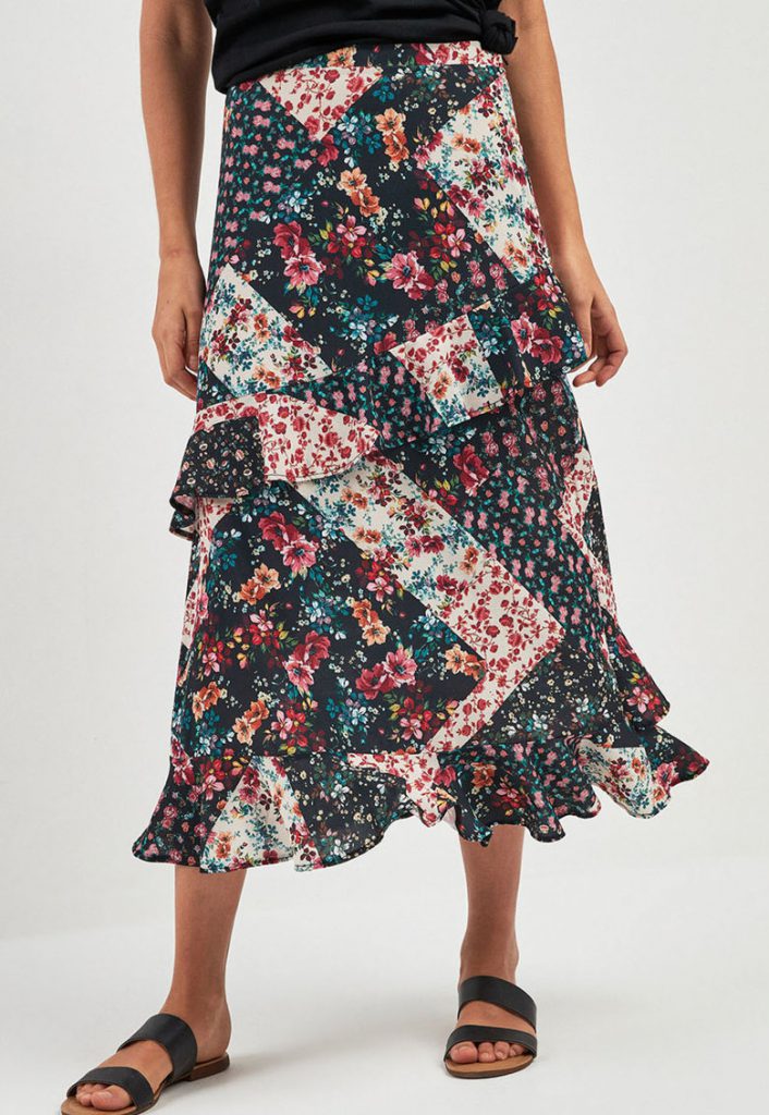 Fusta lunga cu volane si imprimeu este o alegere feminina, perfecta pentru o zi la plaja si beach party