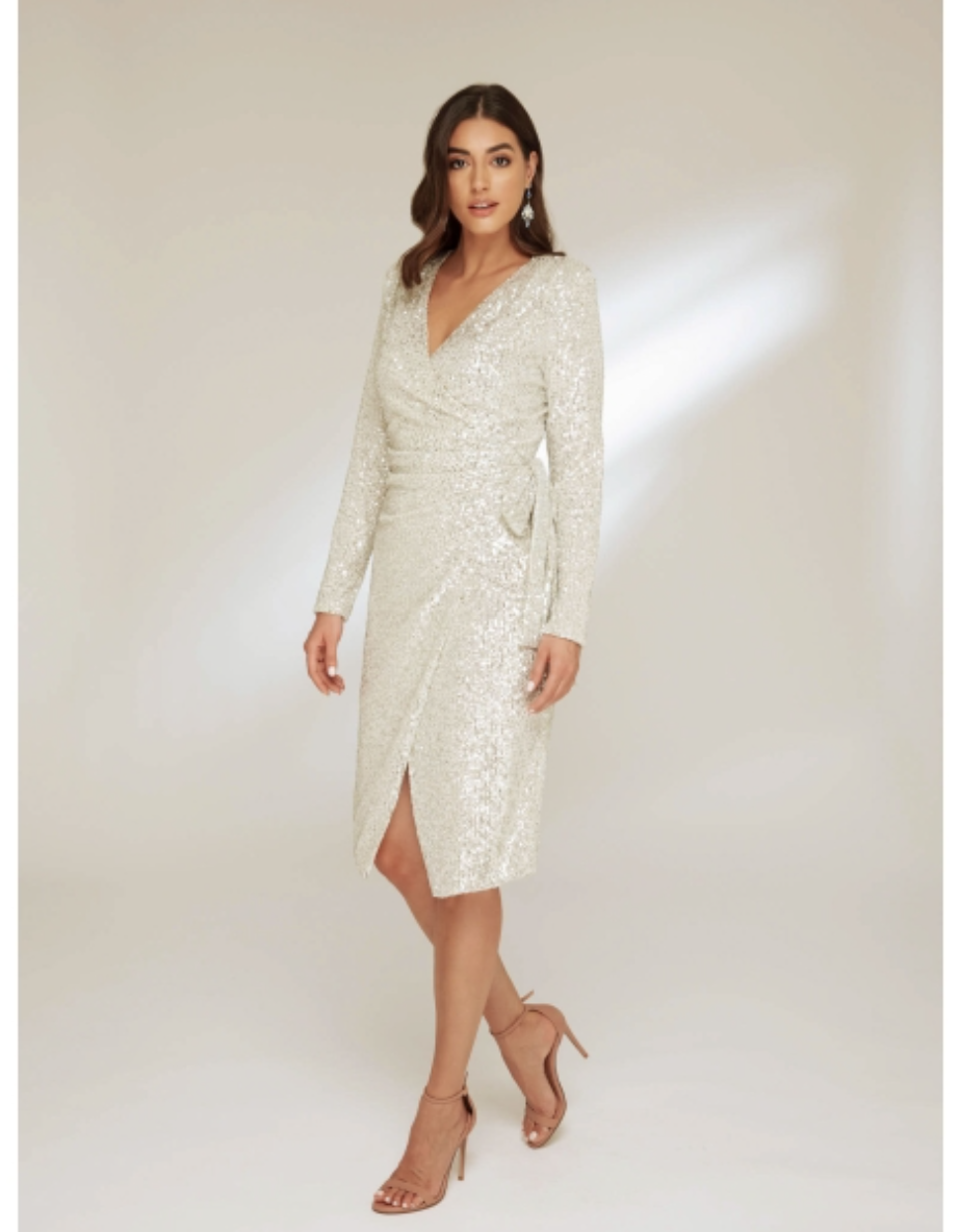 Rochia petrecuta este o rochie versatila, care se potriveste indiferent de silueta, datorita detaliilor precum cordonul ajustabil si decolteul in V. Paietele argintii iti vor scoate pielea in evidenta si te vor face sa stralucesti. Fiind piesa centrala a tinutei tale, nu-ti ramane decat sa accesorizezi cu bijuterii fine si cu o pereche de sandale cu bareta. Iar daca, asemenea mie, esti o iubitoare a machiajului, iti recomand sa incerci un ruj rosu! Vei avea un look sofisticat si indraznet, care va atrage toata admiratia celor din jur.