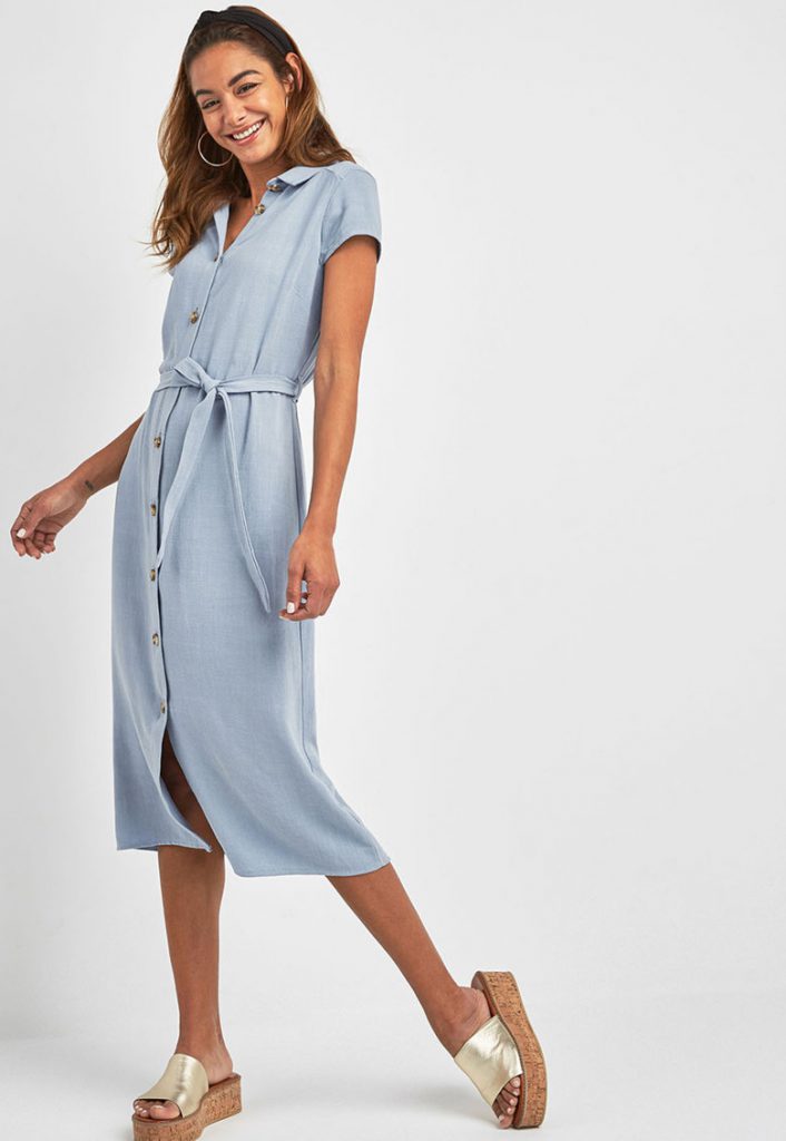 Cum te imbraci la o nunta de vara cand vrei sa maschezi mici imprefectiuni ale siluetei? O rochie tip camasa cu pattern floral poate fi solutia potrivita.