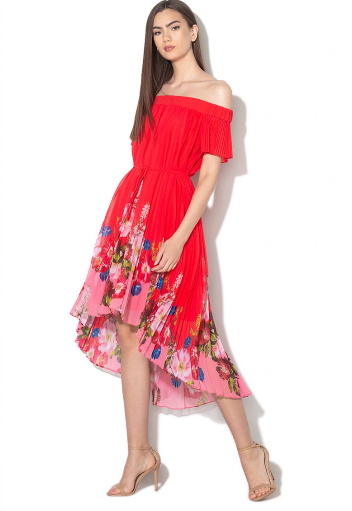 Un plus de romantism nu strica niciodata si ce este mai romantic si feminin decat o rochie fluida, vaporoasa, cu imprimeu floral si umerii dezgoliti?