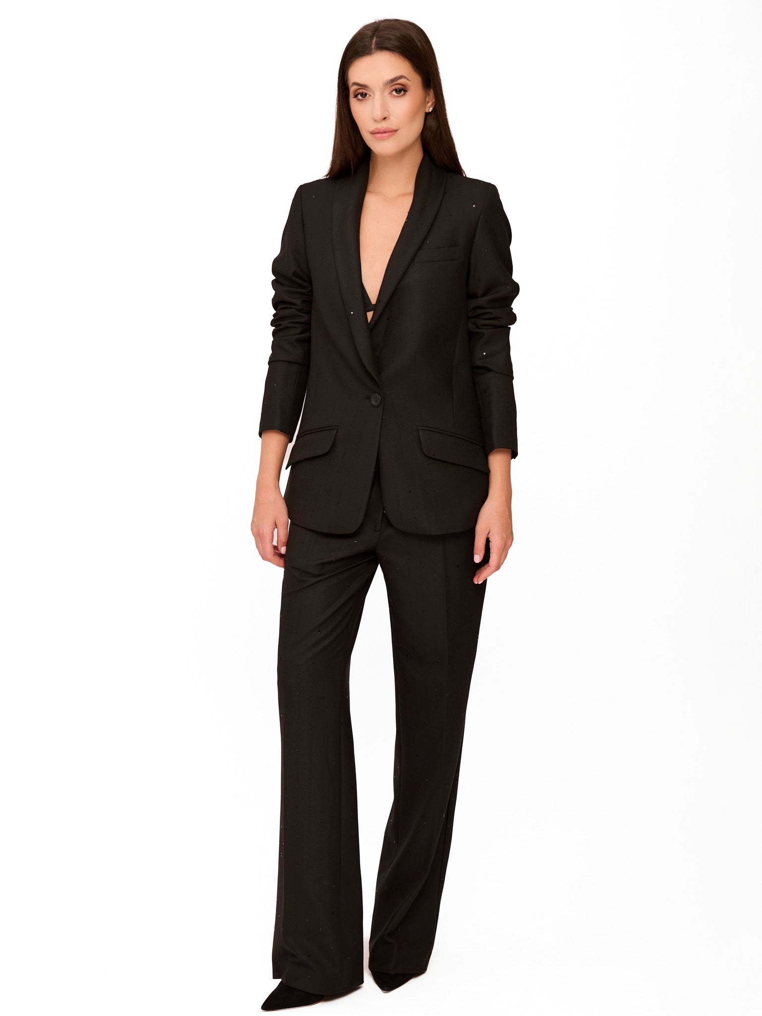 Costumul Dalia este lucrat cu fir de paiete, astfel ca e chiar mai elegant decat un costum obisnuit, fiind potrivit pentru petreceri, cine sofisticate sau evenimente cocktail. Imi place felul in care combina confortul croiului masculin lejer cu feminitatea subtila data de tesatura cu fir metalic integrat in material – perfect pentru un look plin de stralucire. Pantalonii cad frumos pe picior, fiind usor de integrat in tinute formale, de seara sau compozitii office-glam surprinzatoare.