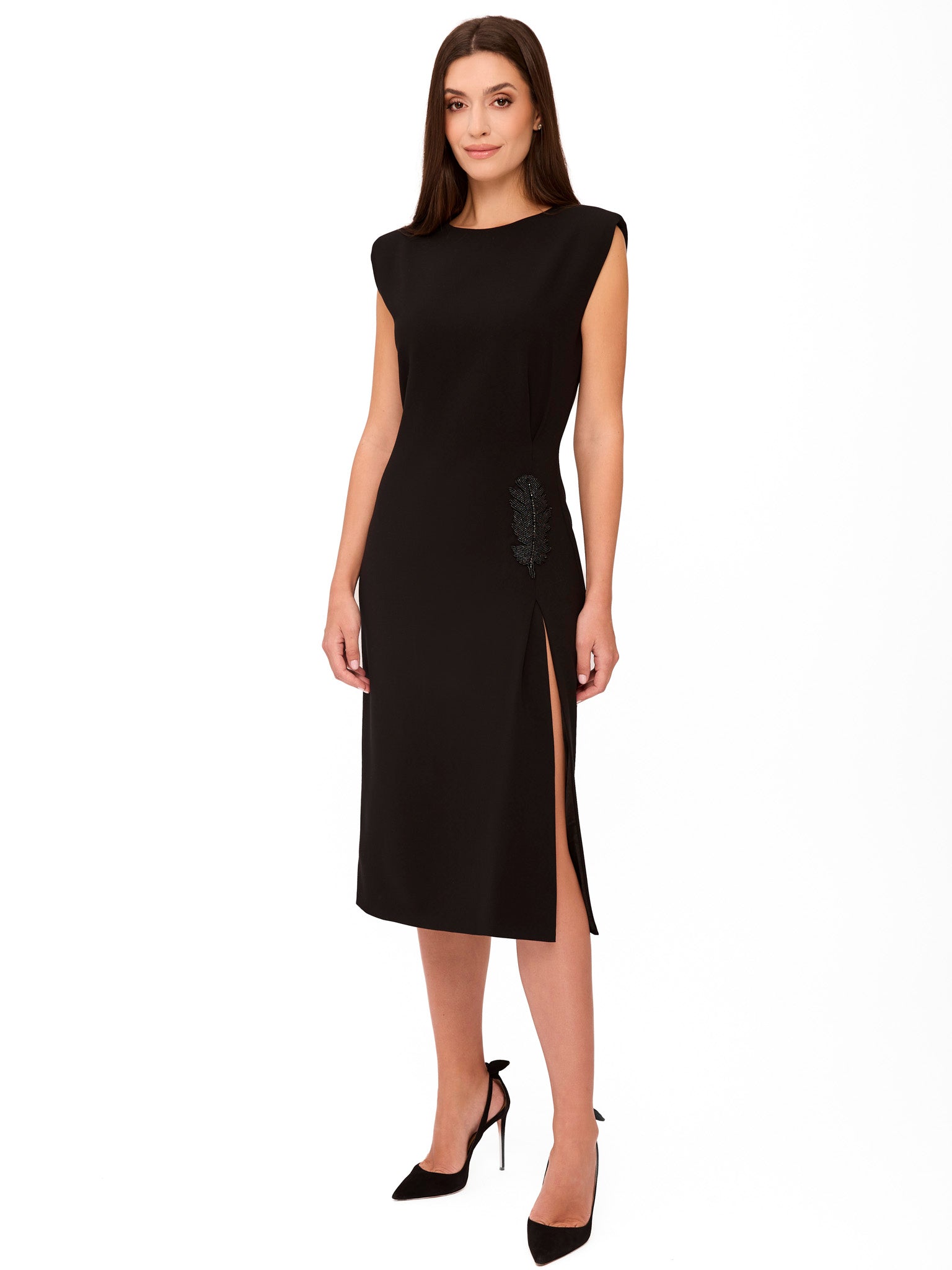 Daca esti alaturi de noi inca de la inceput, cu siguranta iti amintesti de rochia Scarlett cu crapatura pe picior. A revenit intr-o varianta imbunatatita, mult mai eleganta si sofisticata. Te cucereste cu umerii usor structurati si un detaliu care atrage discret toate privirile: pana brodata cu paiete fine, aplicata subtil pe sold.