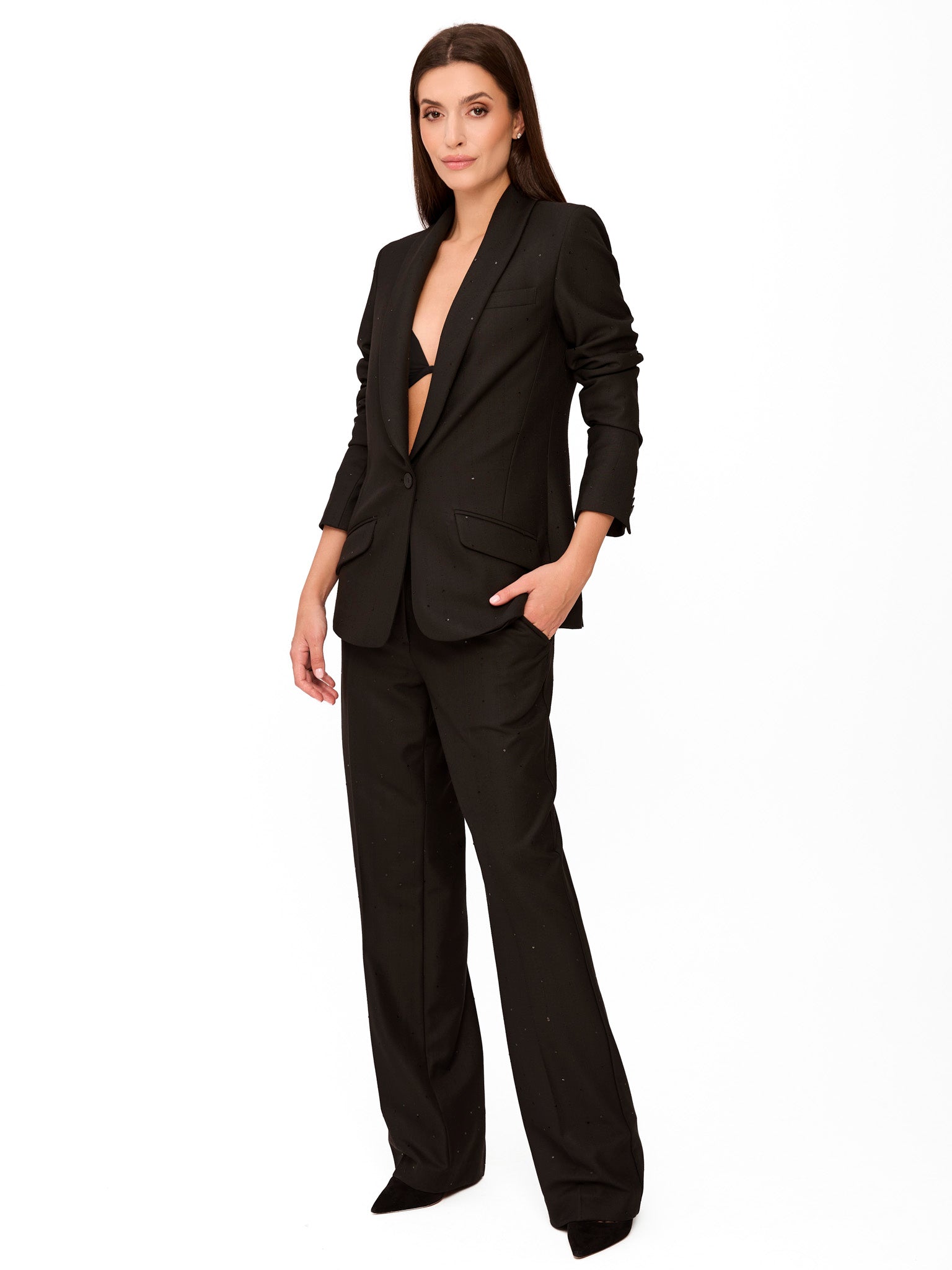 Costumul Dalia este lucrat cu fir de paiete, astfel ca e chiar mai elegant decat un costum obisnuit, fiind potrivit pentru petreceri, cine sofisticate sau evenimente cocktail. Imi place felul in care combina confortul croiului masculin lejer cu feminitatea subtila data de tesatura cu fir metalic integrat in material – perfect pentru un look plin de stralucire. Pantalonii cad frumos pe picior, fiind usor de integrat in tinute formale, de seara sau compozitii office-glam surprinzatoare.