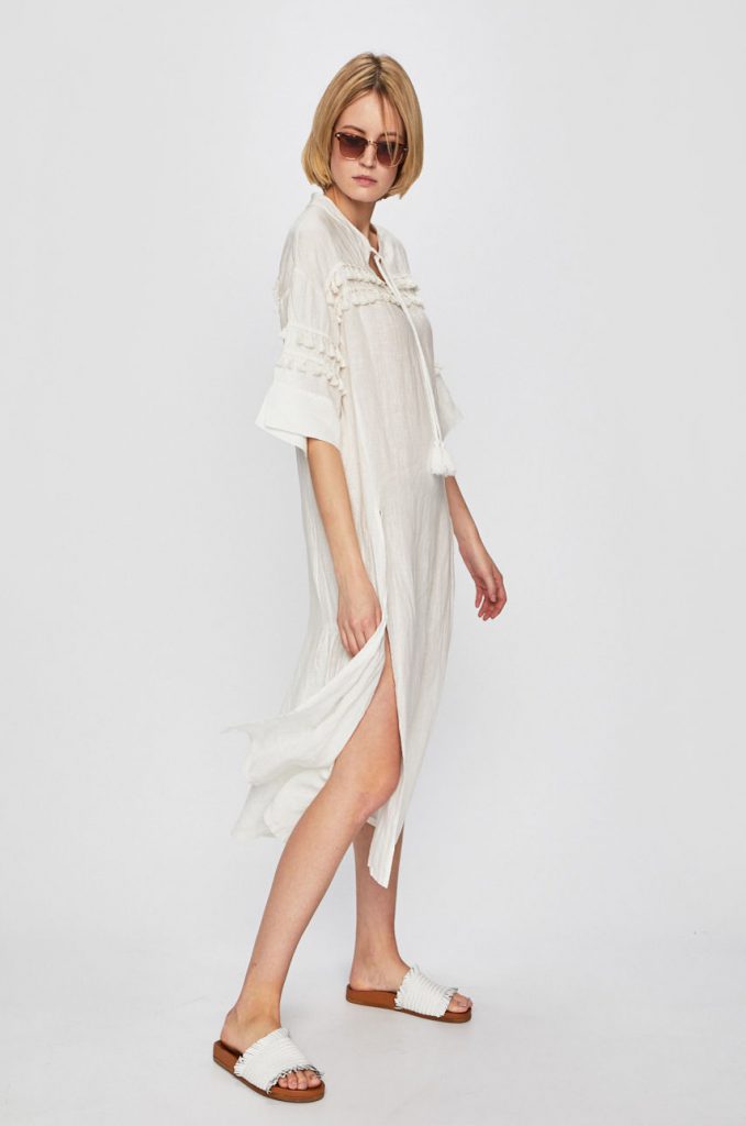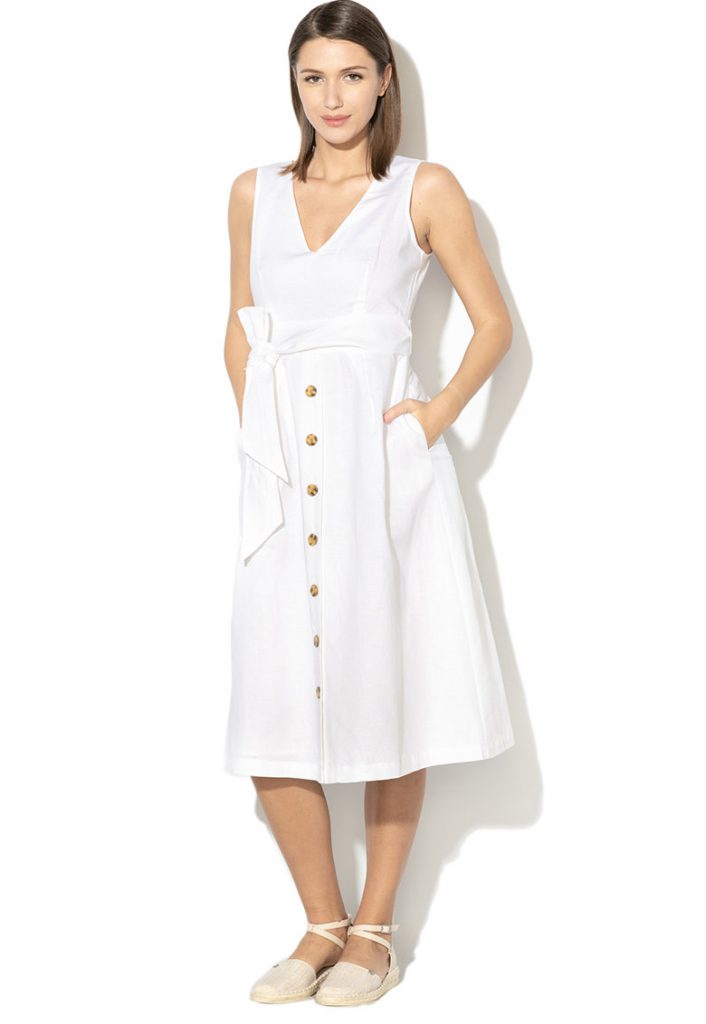 Rochia racoroasa si usoara cu aspect de in se va purta toata vara, mai ales in vacante. Este un stil minimalist, care iti va pune cu siguranta feminitatea in valoare. Poart-o cu accesorii in culori neutre – ochelari de soare si sandale cu talpa plata.
