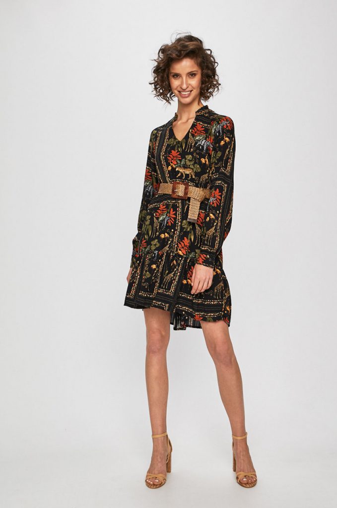 Gulerul stil tunica, croiala lejera si imprimeul floral-vegetal fac din aceasta rochie o optiune perfecta de zi. Poart-o cu centura in talie, cu pantofi sport, sandale si ciorapi cu pattern interesant, la vedere, sau bocanci! Adauga si un cardigan pufos pe deasupra si pune centura sa cuprinzi atat rochia cat si tricotajul.