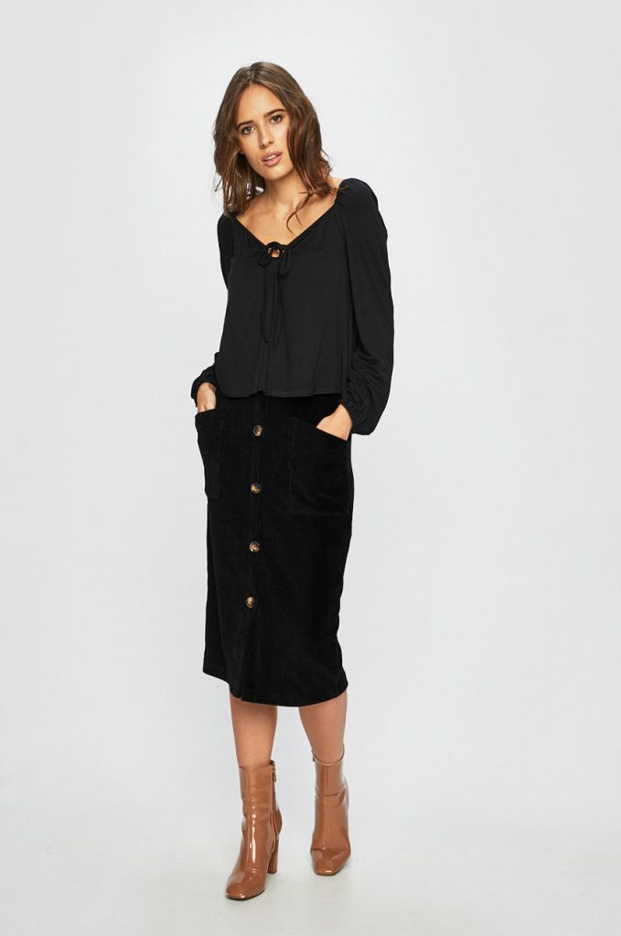 Sparge tiparul unei tinute business all black cu mici insertii de texturi diferite. De exemplu, alege fuste conice din materiale interesante, precum reiatul! O astfel de fusta din reiat si cu nasturi pe mijloc e ideala cu botine, pumps cu tocul gros si balerini cu varful ascutit.
